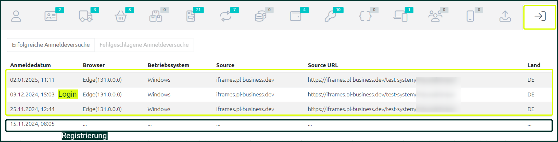 Als Anmeldeversuche wertet das System auch Registrierungen. Registriert sich ein neuer Kunde erfolgreich wird ein Eintrag in der Login-Historie erstellt. Aus technischen Gründen enthalten diese Einträge allerdings keine näheren Informationen zu Browser, Betriebssystem und Quelle der Registrierung.