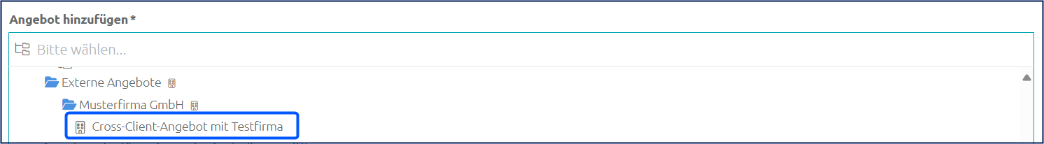 Im Ordner Externe Angebote ist das Cross-Client-Angebot zu finden. - Zusätzlich kann mithilfe eines Textbausteins ein zusätzlicher beschreibender Text hinzugefügt werden.