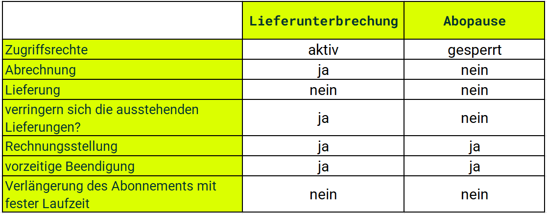 Was ist der Unterschied und welche Auswirkungen haben eine Abopause und eine Lieferunterbrechung auf beispielsweise Zugriffsrechte, Lieferungen, Abrechnung und Rechnungsstellung?