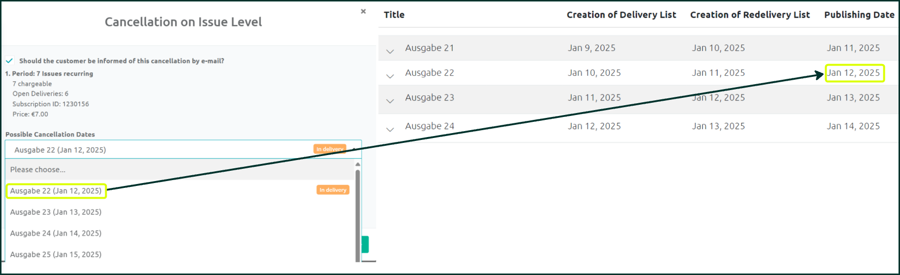 If a partial cancellation is triggered, the cancellation cannot be withdrawn. For issue-based subscriptions, payment is processed at the beginning of the accounting period. Cancellation on issue level, therefore, always triggers a partial cancellation.