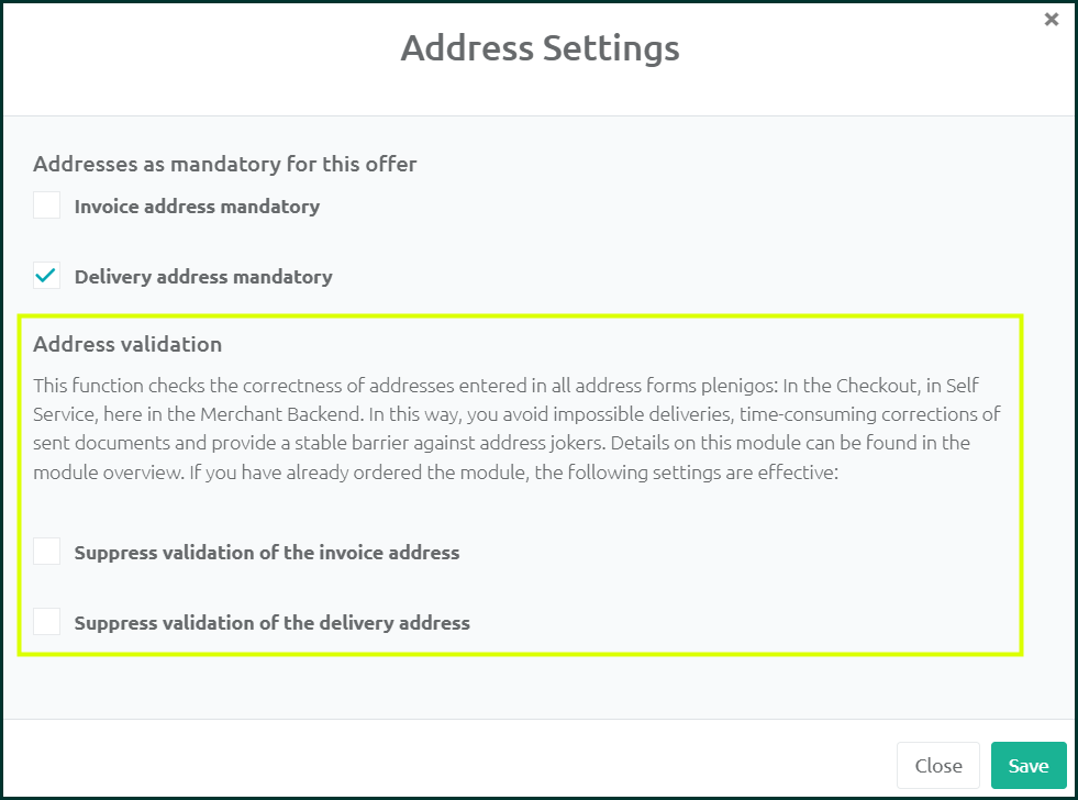 If Validate Invoice and Delivery Address is selected, both addresses are always be requested and checked. Only one of both options can be selected.