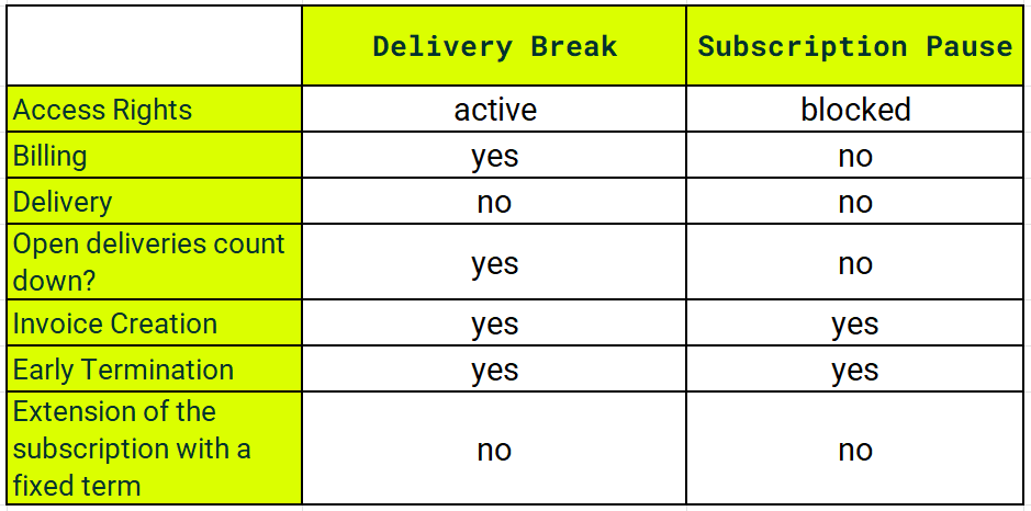 A subscription pause and a delivery break can be set in the Merchant Backend at a customer's subscription, as well. More detailed information about the differences between delivery break and subscription pause can be found in the following entry >> Subscription Pause and Delivery Break