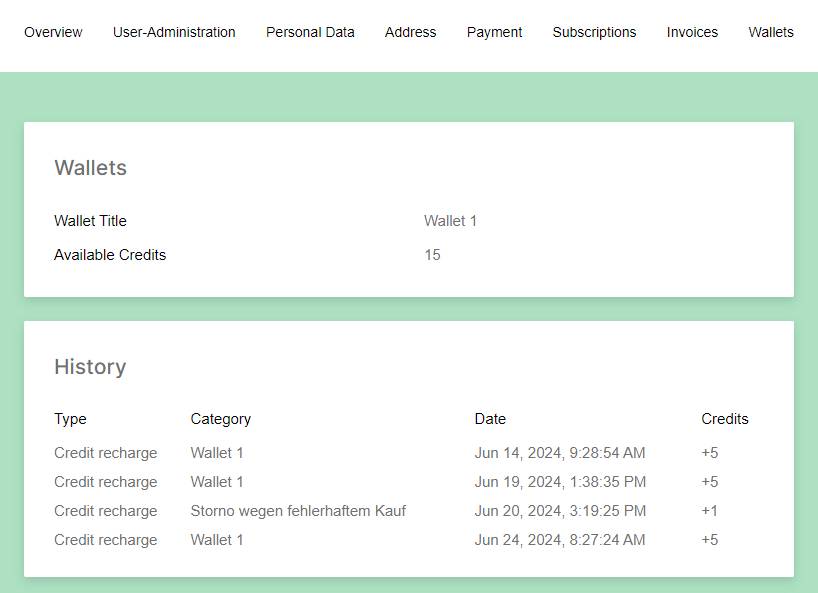 In Self Service, the customer has the option of managing their personal data, payment data, subscriptions, invoices and wallets (for credit-based offers).